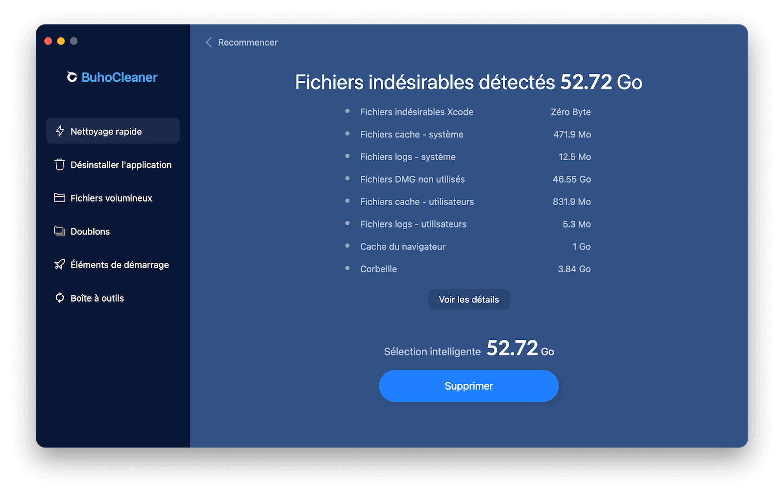 En fait, vous pouvez aller dans le Finder pour rechercher et supprimer manuellement les fichiers ou les applications dont vous n'avez pas besoin. Mais ce processus peut prendre beaucoup de temps. Nous aimerions vous présenter un moyen plus simple de le faire, en utilisant BuhoCleaner, un nettoyeur pour Mac simple et pratique. Cet outil vous permet de trouver des dizaines de gigaoctets de fichiers inutiles en un seul clic. Il vous suffit de sélectionner les fichiers dont vous voulez vous débarrasser et de cliquer sur le bouton Supprimer. Cliquez sur le bouton ci-dessous pour l'essayer.