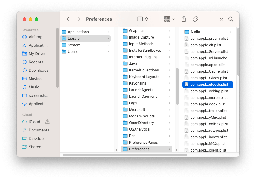 - Find the com.apple.Bluetooth.plist/com.apple.Bluetooth.xxx.plist file and delete it.