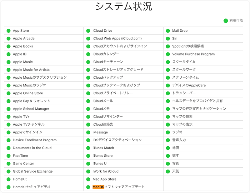 アップデートの問題は、Appleのサーバーに問題がある場合に発生することもあります。その場合にやるべきことは、Appleのシステム状況のページが表示されているかどうかを確認することです。次に、macOSソフトウェアアップデートを探し、その状況を確認します(緑は利用可能、赤や黄色はAppleのサーバーに問題があり、待つしかないことを意味します)。