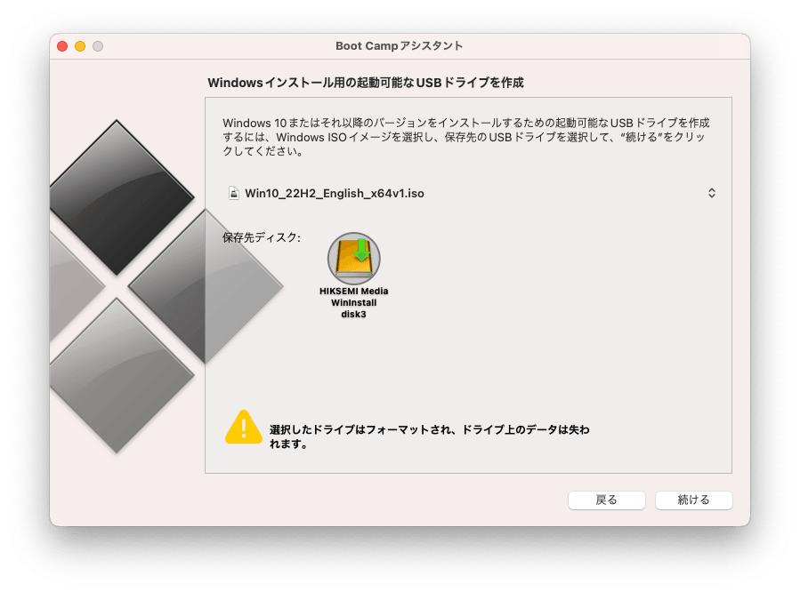- Windows ISOイメージと接続したUSBドライブを選択し、「続ける」をクリックする。