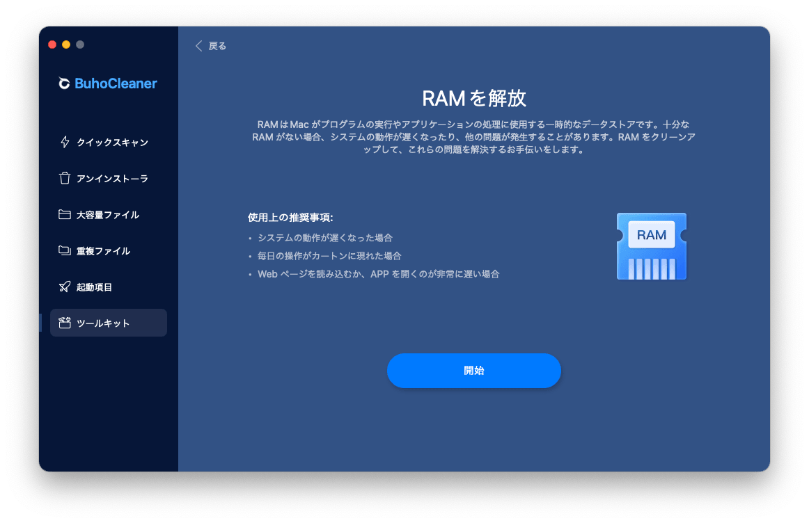 BuhoCleanerをMacにダウンロード&インストールすると、メニューバーからRAMを解放して、お使いのMacBookの動作を軽くすることができます。