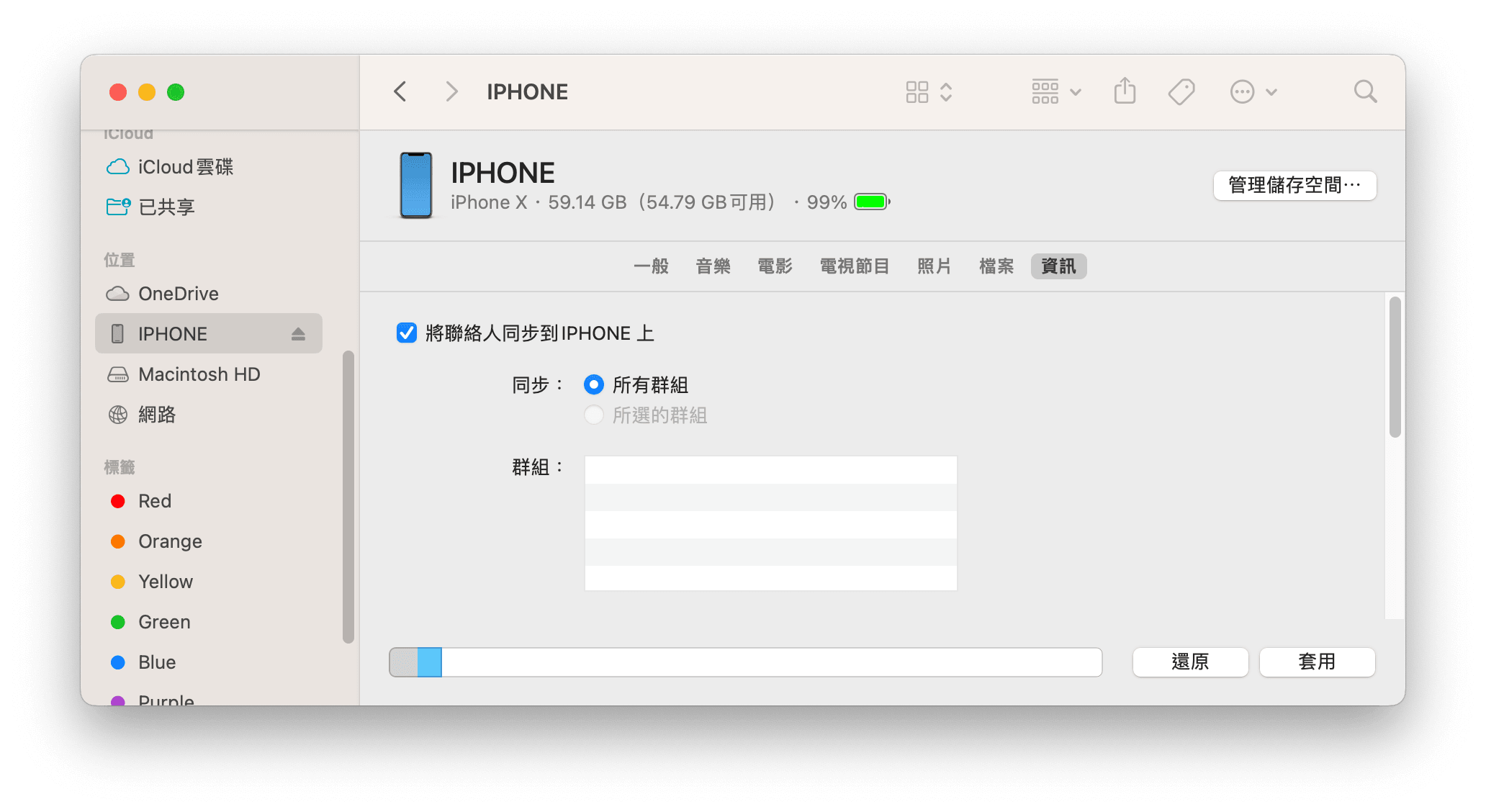 如何透過「Finder」或「iTunes」將聯絡人從 iPhone 同步到 Mac
