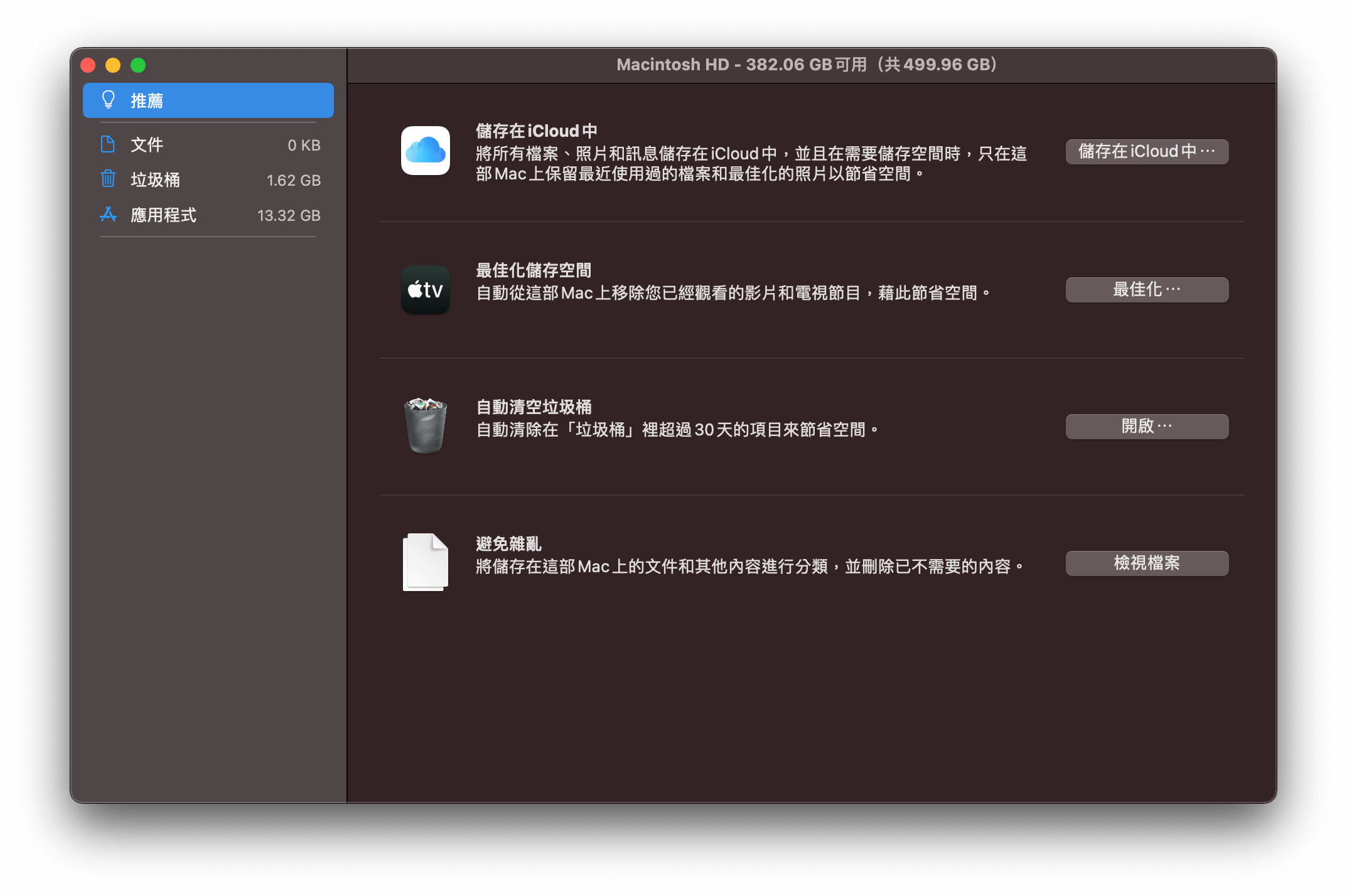 方法 2:按照「推薦」優化 Mac 儲存空間